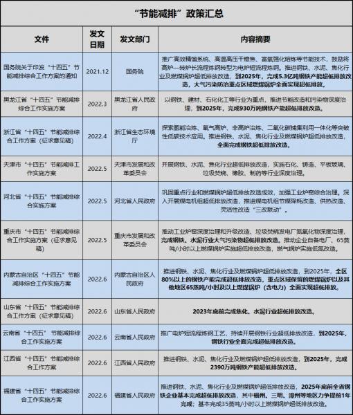 2021年12月,国务院印发“十四五”节能减排综合工作方案,工业行业超低排放改造被列入节能减排重点工程:推进钢铁、水泥、焦化行业及燃煤锅炉超低排放改造,到2025年,完成5.3亿吨钢铁产能超低排放改造,大气污染防治重点区域燃煤锅炉全面实现超低排放。 各地纷纷跟进,根据自身实际情况制定政策,截至发文,共有10个省(自治区、直辖市)发布“十四五”节能减排综合工作方案,其中对超低排放工作的要求不尽相同。 火电方面,各地基本以35/65蒸吨为限,淘汰小机组,推动大容量机组超低排放改造。
